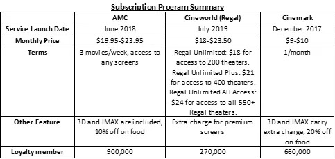 通过公司资产获利的关键是名为Stubs A-List程序(“ A-List”)的订阅服务。A-List计划是一项按月订阅服务,订户可以每周观看三次任何屏幕,包括付费屏幕,视状态而定,价格为$ 21- $ 24.99。