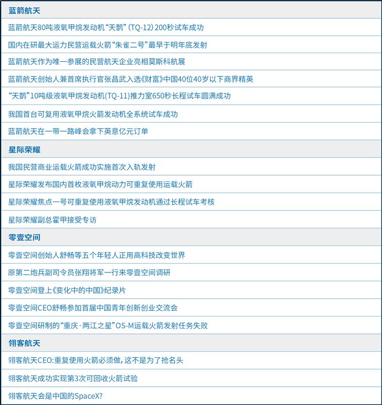 虽已经过近5年发展,但相比备受瞩目、作为国家象征的国有航天而言,民营航天实际上处于非公众关注范围。或者说,在绝大多数公众头脑中,并没有民营航天的概念。因此在对境内主流媒体及媒体平台的分析中可以看到,信息源头或者为企业自己的社交媒体账号,或者来自国有媒体和财经(行业)媒体,而其他机构、个人发布的相关信息也基本来自后者。