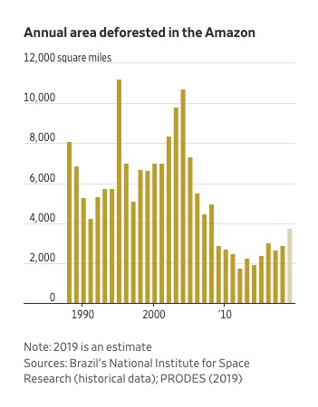 巴西国家空间研究所(INPE)11月公布的新数据显示,亚马孙雨林的去森林化速率已经到11年以来的最高水平。从2018年8月至2019年7月这一年间,亚马孙雨林破坏的面积达9762平方公里,同比增加30%。