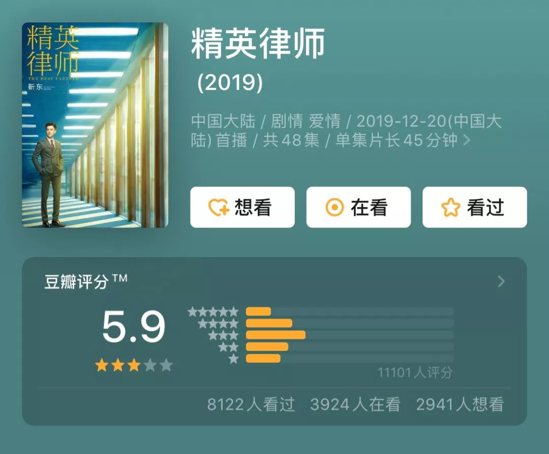12月20日《精英律师》开播后,播放成绩表现上佳,不仅曾连续一周位居收视率榜前三,收视破1也轻松实现,在艺恩数据上,这部剧的播映指数达81.49,网播方面,播出6天,腾讯视频播放次数达3.9亿,在年底播出的卫视剧中身居高位。然而从口碑上来看,豆瓣评分从6.5跌至5.9,《精英律师》称得上是“扑街”了。
