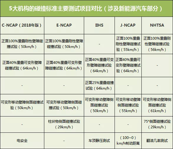 为预防这一系列问题,电动汽车应该对碰撞电安全要求十分严格。但下表是五大测试机构针对新能源汽车的现行测试标准,能看出还没有形成统一且独立于新能源汽车的准则。