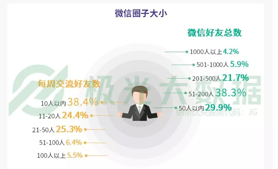 极光大数据发布的《2019年社交网络行业研究报告》显示,将近七成的微信好友数少于200人 ,超过6成用户每周交流的好友数不超过20人。