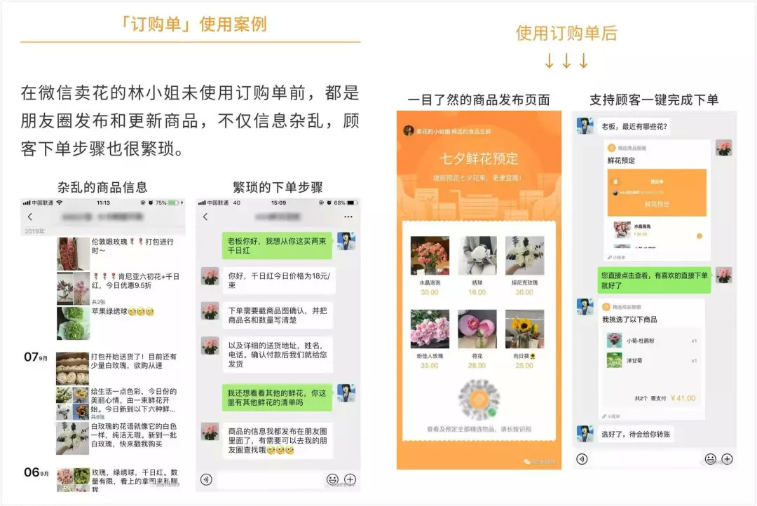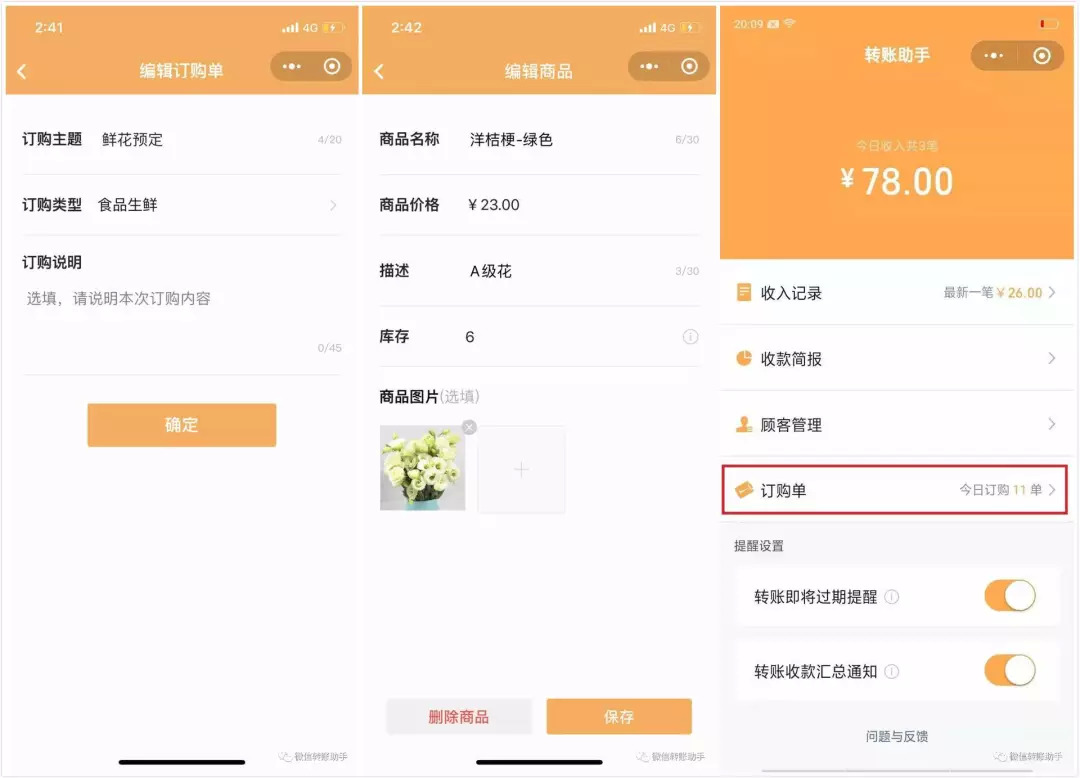 在「微信转账助手」介绍中,“订购单”主要有三个功能:便捷发布多个商品信息、一键转发分享给顾客自主下单、自动统计订购记录。