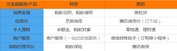 基于网购交易的阿里金融业务,与基于个人类交易的腾讯金融业务,在消费金融、信用生活、个人理财、商户服务等领域展开了直接竞争。