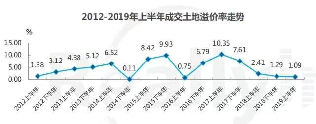 在溢价率方面,2019年上半年土地市场溢价率走低,全市成交土地的平均溢价率为1.09%; 整体来看,超8成土地为底价成交,溢价率超20%的土地宗数占比仅为3%。