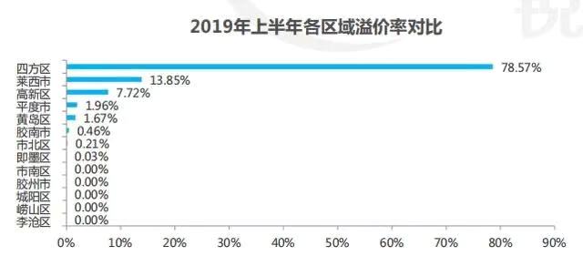 从各区域上半年溢价率来看,原四方区为溢价率最高的区域,整体溢价率为78.57%,这主要是因为上半年碧桂园以78.6%的溢价率拿下金华支路14号地块,拉高了区域整体溢价。
