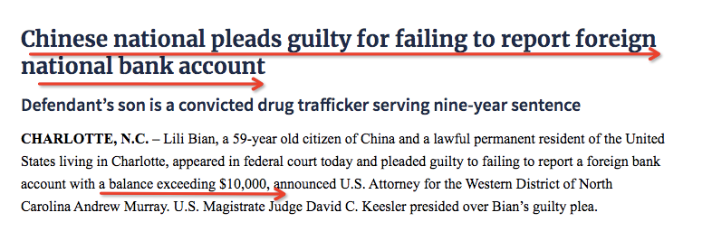 她持有美国绿卡,承认在中国境内某金融机构,有超过1万美元的账户,且未向财政部上报外国银行和金融帐户表格(Foreign Bank and Financial Account Form,FBAR),继而遭到联邦起诉。