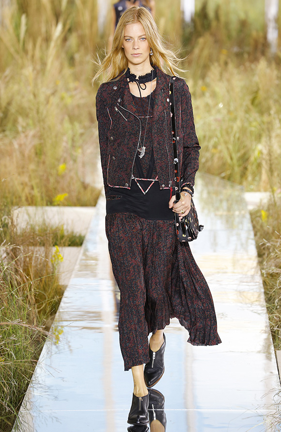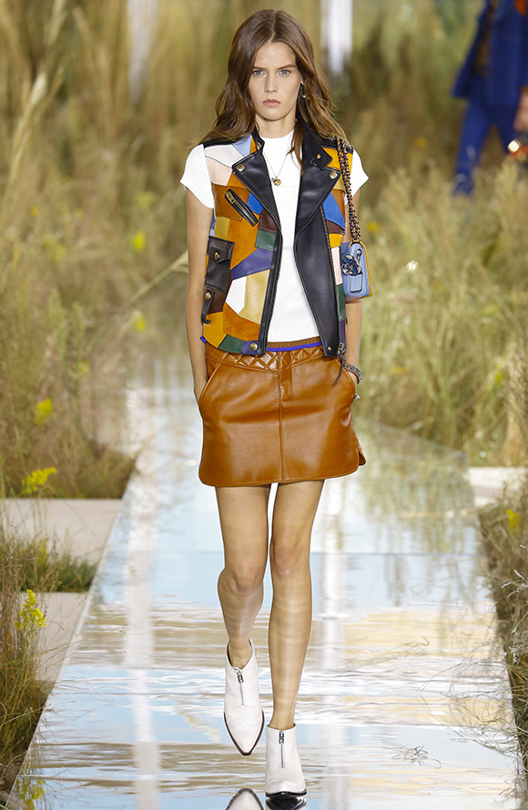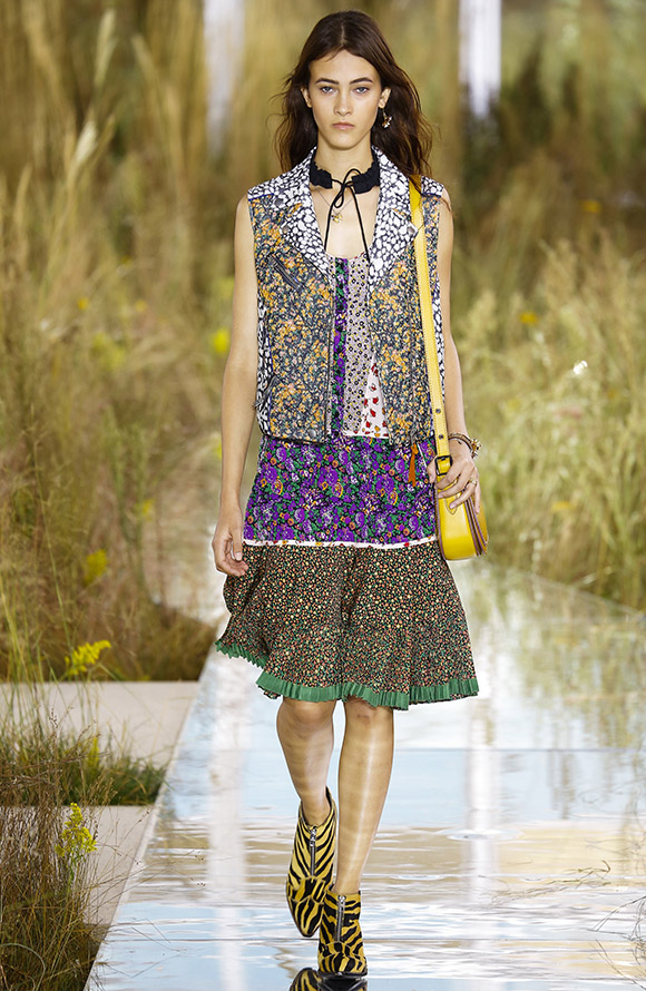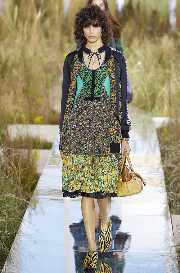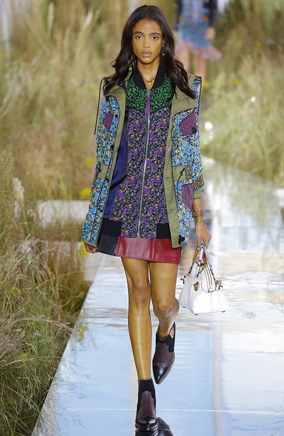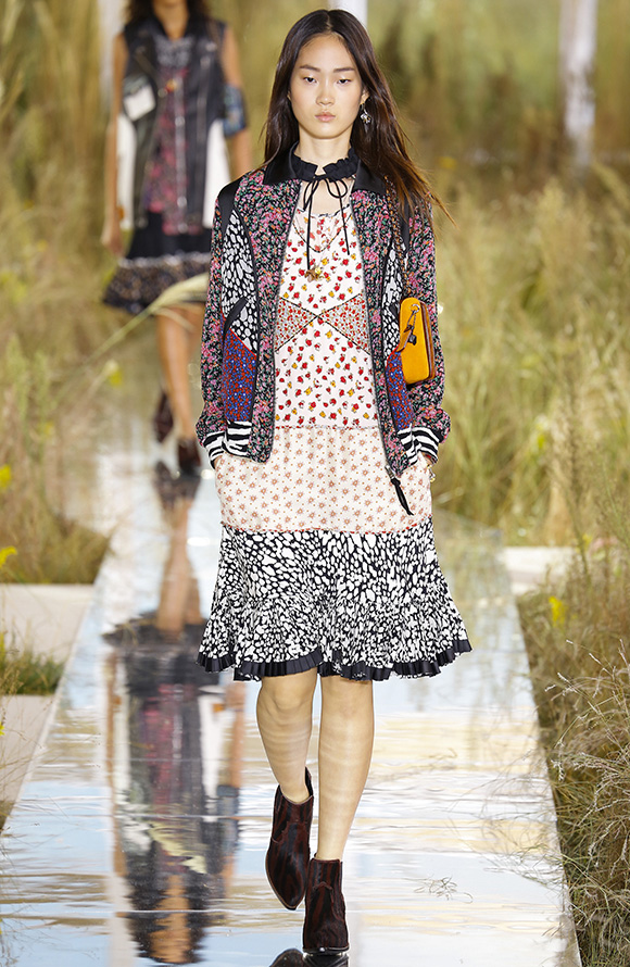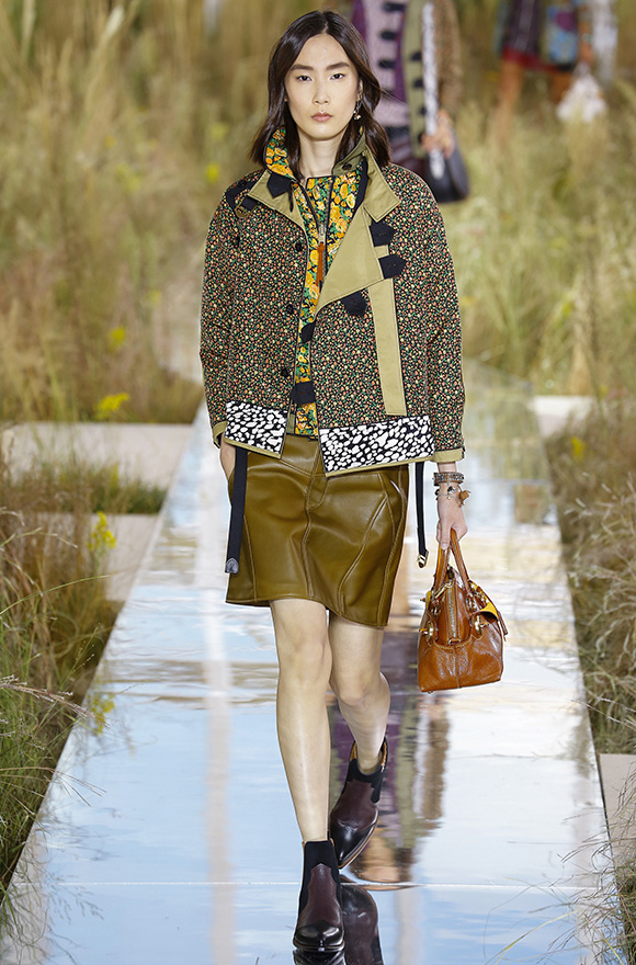 Coach整个发布会的秀场,被布置成了杂草丛生的荒原,T台的镜面质地有点像湖面;身穿碎花雪纺衬衫和鱼尾裙的模特披上了拼接皮革外套,亦媚亦刚,真想唤一声小野猫。