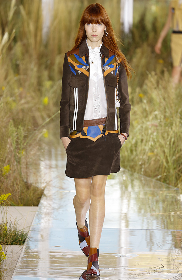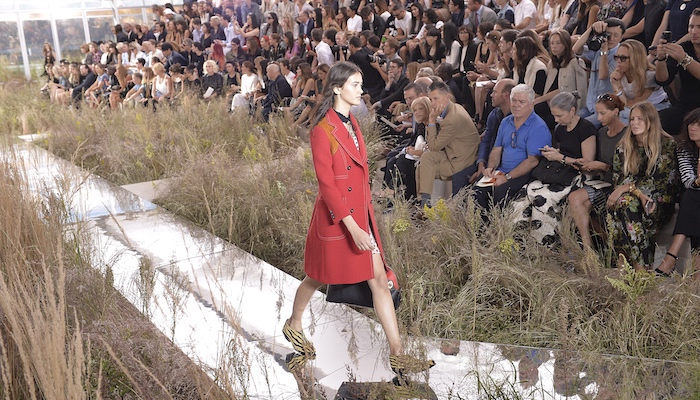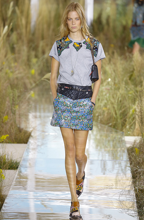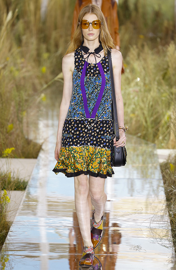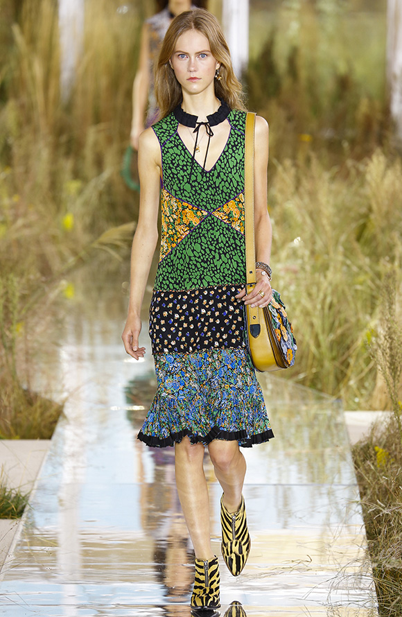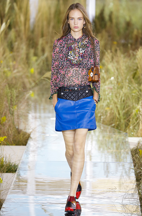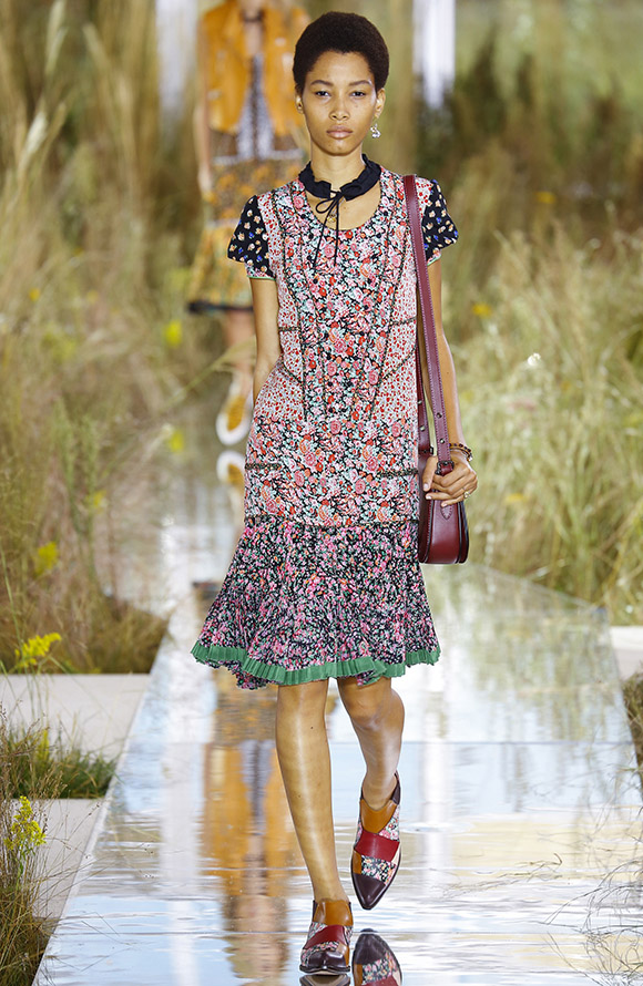 Coach整个发布会的秀场,被布置成了杂草丛生的荒原,T台的镜面质地有点像湖面;身穿碎花雪纺衬衫和鱼尾裙的模特披上了拼接皮革外套,亦媚亦刚,真想唤一声小野猫。