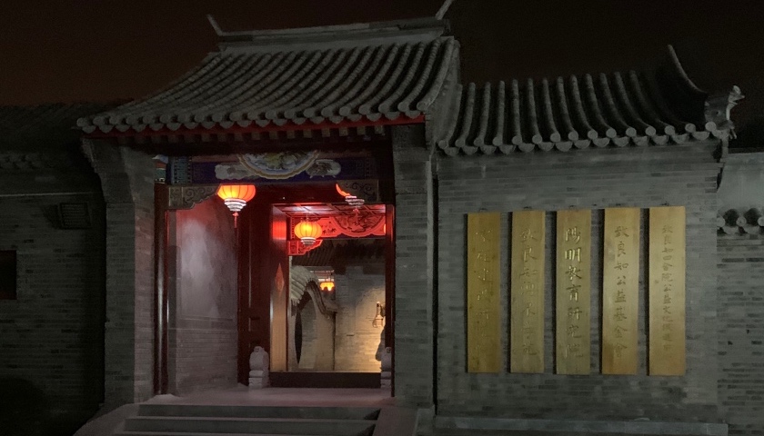 门口有两座神兽石像,走进去,大门右边悬挂着五块牌匾,分别是致良知四合院公益文化促进中心、致良知公益基金会、阳明教育研究院、致良知涌泉学院、家庭建设研究院。