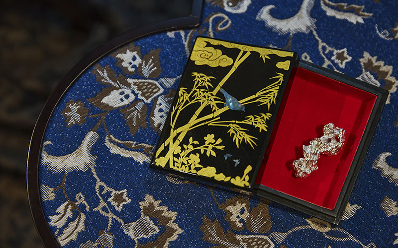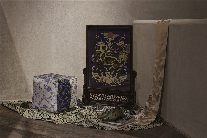 屏风上看似随意挂上的钉珠亮片组合真丝花纱,沙发上垂落的锦带,小几上摆设锦盒中的银饰、螺钿小盒与花几宝蓝色布料呼应的蓝鸟、蓝蝶,插屏下的布料及布料之上的锦鞋,这些细节之处增加了整个空间的鲜活感。在这个空间对面,脱离器物的布料以类似染坊中悬挂染布的方式呈现,丰富的陈列却给人以中国画的既视感。