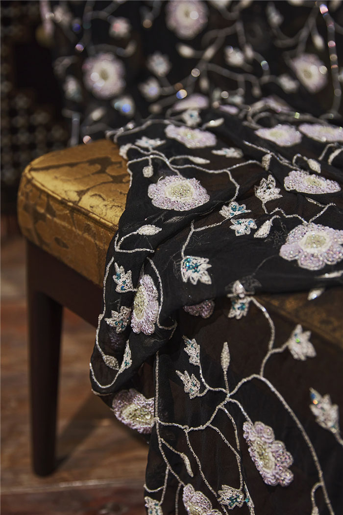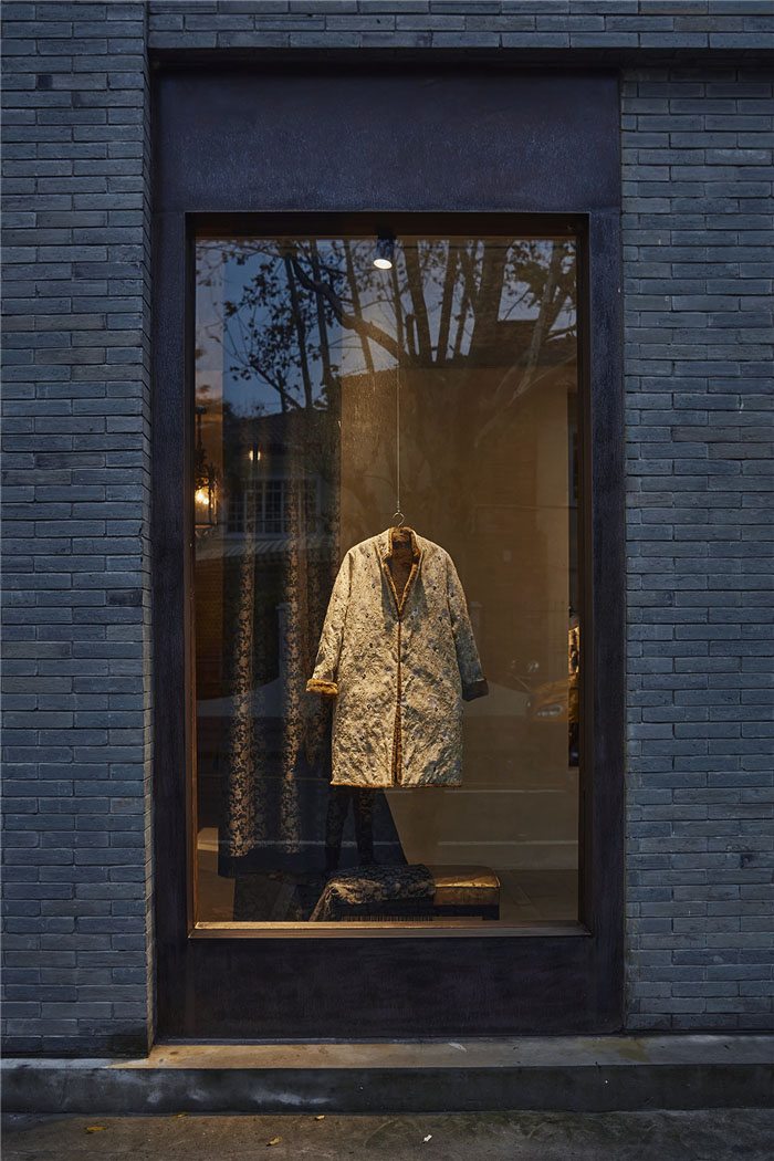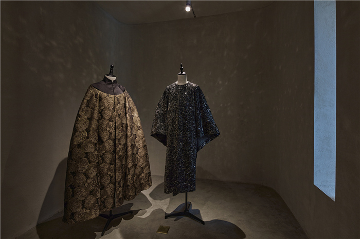 全真丝刺绣缀珠皮毛里大氅是在进店前透过Autumn Sonata橱窗看到的第一件展品,面料产地为印度。大氅属于传统汉服中男式罩衣的一种,特点为对襟大袖,浪金将大袖改为窄袖,取缔了原有的系带,整体设计更具现代感。走进店内,一楼隔间中两件由浪金团队设计的服饰,其中一件为意大利面料制成的植金线大花织锦立领斗篷。传统、手工、东方元素是展出的几件由异域面料制成的传统服饰共同的关键词。