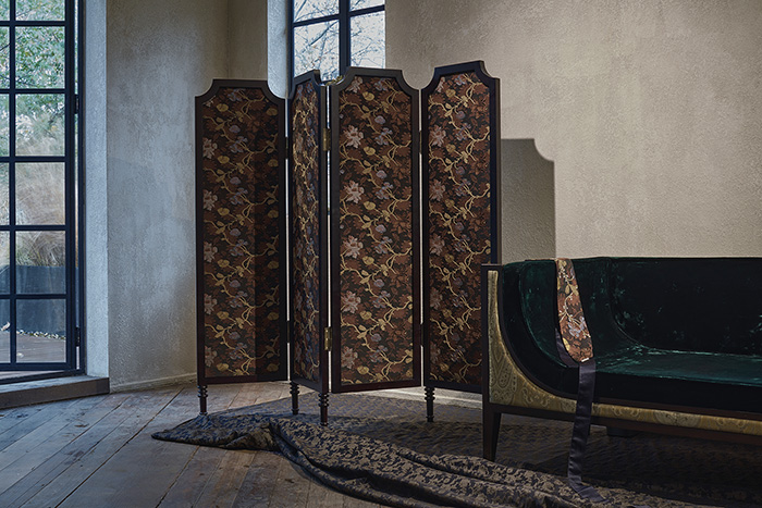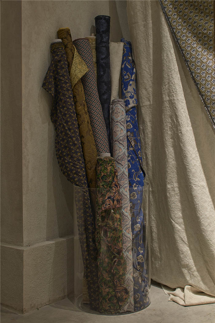 浪金邀请了品牌策划团队LE PASSAGE进行策展,从稀珍面料出发,将手工艺之美在器物上传续。展览选址于由上海老洋房改建,法租界太原路上买手店Autumn Sonata,复古而摩登的店内氛围与艺术展整体风格十分契合。从展品上,“布流”展可以分为三个部分:单独面料,面料与服饰、面料与家具。