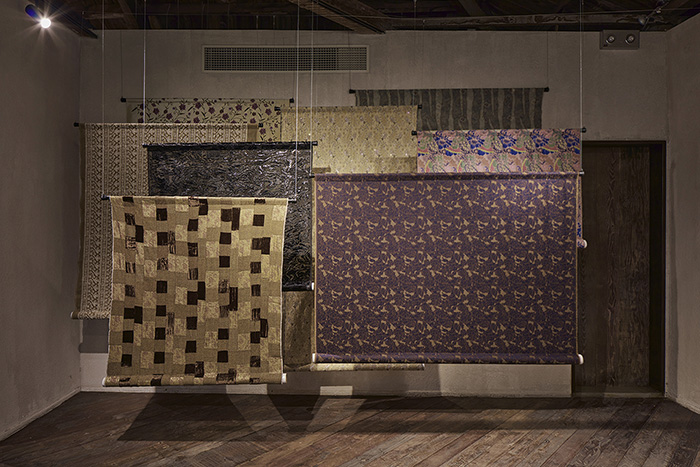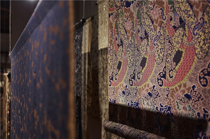 张彬毕业于美术设计专业,热衷东方古典与现代设计,于2016年创立文化时装品牌浪金,“独有面料与精致工艺”是品牌立足点。浪金面料收藏展收集了来自意大利、法国、中国、日本、非洲等地的面料,“意大利非常夸张的织锦,印度的一些缀珠面料,非洲风格的天然面料,还有中国手工艺的缂丝、真丝刺绣这些,”张彬向我们介绍了本次所展出的部分面料。
