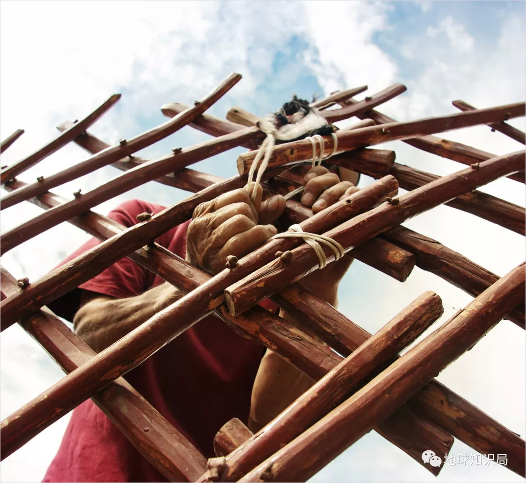 在固定好支架之后,则要立起天窗,并用一根根粗细长度统一的木条将天窗与“哈那”连接起来。