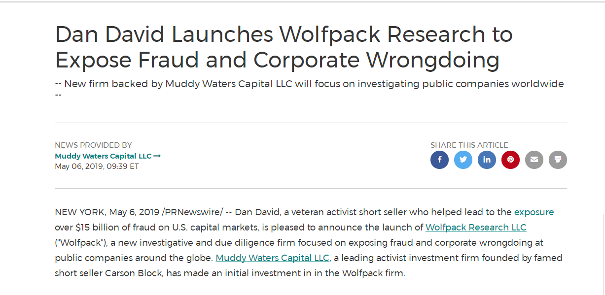 2019年5月6日,自从Wolfpack Research诞生以后,这个号称维持金融生态平衡的公司总是试图在资本市场搅起风浪,当然,获得市场关注也是他们的一个主要目的。