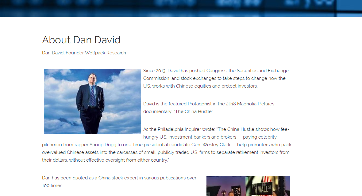 公开资料显示,作为Wolfpack Research的创始人,Dan David出生在美国的宾夕法尼亚州,在其职业生涯的早期,曾在大型连锁零售商中管理珠宝部门。2006年,据美国《机构投资者》(Institutional Investor)报道,他与其他人共同创立了一家名为GeoInvesting的研究公司,该公司曾指出中国公司欺诈,是做空中国公司的始作俑者,擅长通过舆论来做空股票,尤其是中国公司,从而谋取暴利。