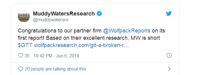 对此,关于Wolfpack Research的行为,美国著名的卖空者Muddy Waters推文发文说Wolfpack Research是典型的想做空GTT。