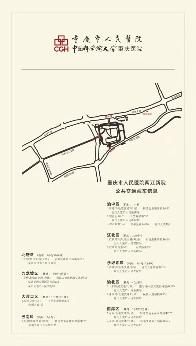 另外,市民还可通过轨道换乘公交抵达医院。在3号线红旗河沟站、金童路站,5号线重光站,6号线康庄站,下车后均可换乘公交到达医院。换乘公交:625路、848路。主城各区、区县及重庆周边的就诊群众也可以通过轨道换乘公交到达医院。