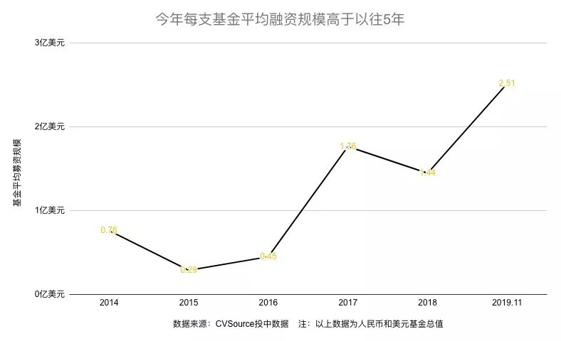 这会导致基金的寡头化趋势更加明显。GGV纪源资本管理合伙人符绩勋认为,有影响力的知名基金可能会融更多钱。CV Source投中数据显示,截至2019年11月,每只基金平均融资金额为2.51亿美元,2018年为1.44亿美元,这一数字是2014年以来最高。