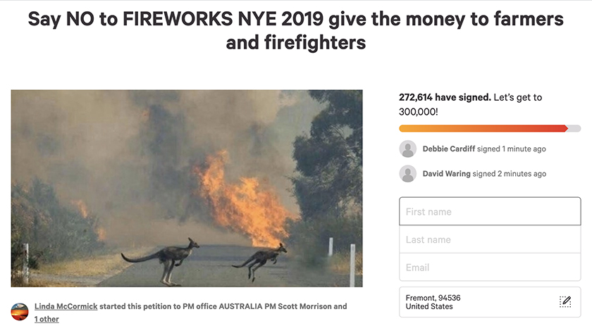 截至北京时间30日13时,在请愿网站Change.org上,已有超过27万人签署了请愿书,要求取消悉尼跨年焰火晚会,将省下来的资金交给农民、消防员与动物看护员,以保护澳大利亚的野生动植物与生态。