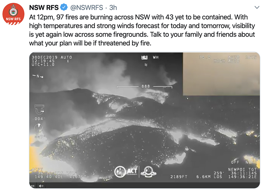 尽管焰火晚会照常举行,但悉尼所面临的山火威胁仍不容小觑。周二该市的气温仍将突破40摄氏度,截至当地时间30日中午12时,新州仍有97处着火点,其中43处不受控制,新州RFS已部署了超过2000名消防员,为周二可能因高温与大风加剧的火情待命。
