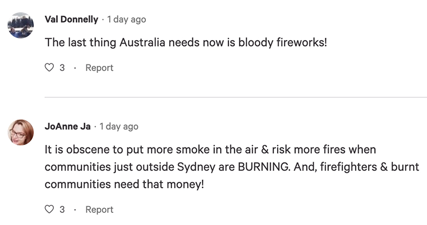 在请愿帖的评论区,人们留言说,“澳大利亚现在最不需要的就是焰火!”“如今悉尼外围大火肆虐,竟然还要制造更多烟雾与火焰,实在是太可怕了。更何况,消防员和受山火影响的地区需要这些钱!”