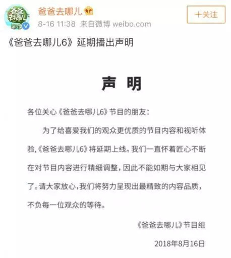 然而属于《爸爸去哪儿》的高光时刻却在2018年的暑期戛然而止。8月15日,官方微博还在推送第六季的宣传物料,并@了陈小春、杨烁、包贝尔、耿乐、何猷君等节目嘉宾,8月16日却在距离播出只剩20分钟的时候发布了延期声明,表示需要“对节目内容进行精细调整”。谁都没有想到,这次延期变成了遥遥无期,《爸爸去哪儿》的微博也至此没有再更新过。