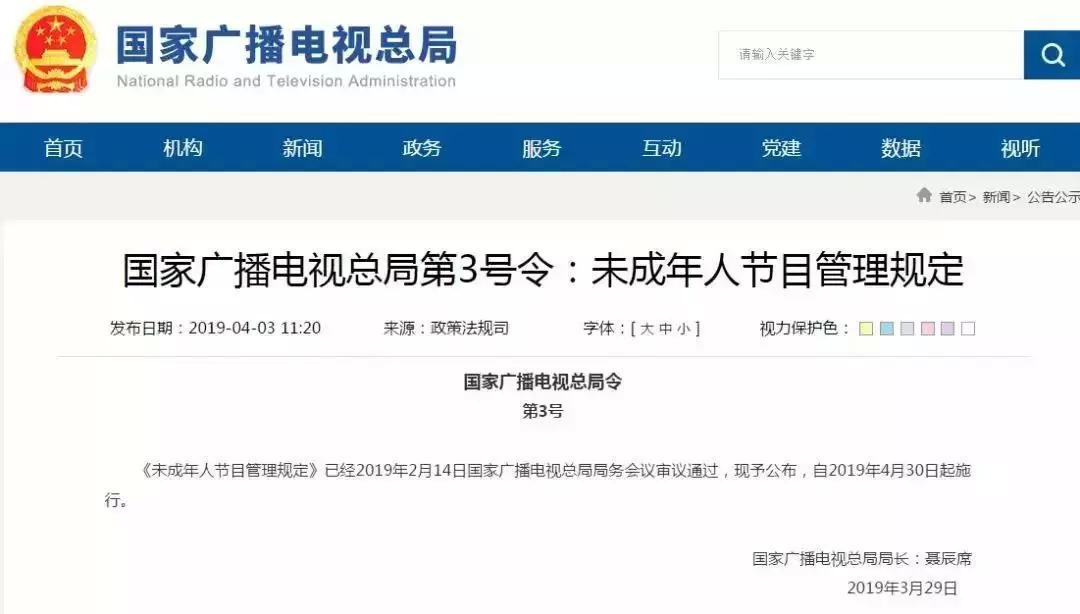 2018年8月24日,广电总局发布的关于《未成年人节目管理规定(征求意见稿)》公开征求意见的通知,既对此前监管政策做出了强调和升级,也对广播电视平台和内容的监管提出了的新要求。而今年4月这一规定通过审议,正式公布。