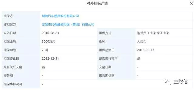 天眼查还显示,瑞鹄模具共有15起对外担保公告,大多为关联担保。但值得关注的是,其中报告期内有两起对芜湖市民强融资担保(集团)有限公司的担保,担保方式均为连带责任担保、保证担保,担保金额分别为5,000万元、420万元,其中一笔5,000万元的担保终止日为2022年12月31日,而这起担保事项招股书中未披露。