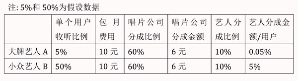 这些数据都是假设数据,在大服务平台上,小众音乐人的收听比例可能会更低。当然,本来优胜劣汰就是一种社会机制,好的应该赚得多,不那么好的就应该赚得更少,这个没有任何问题。但是笔者仍然认为商业运作的因素对此影响很大,可以对其它模式进行尝试。