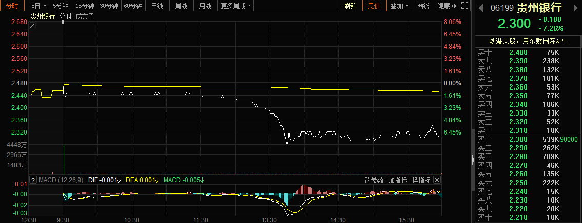 12月30日,由茅台集团担任第二大股东的贵州银行,今日在港交所正式挂牌交易,而上市首日开盘即破发,盘内更是跌超8%。截至当日港股收盘,贵州银行较发行价2.48港元下跌7.26%,报2.3港元。