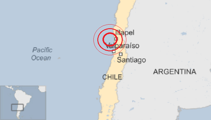 美国官员表示,地震发生在周三晚上7点54分,震中位于首都圣地亚哥西北方向141英里的海域,震源深度4.8英里。