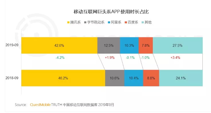 内容吸引力不够,导致百度的MAU虽然很大,但用户使用时间短:据QuestMobile,2019年9月,移动互联网巨头系APP使用时长占比中,百度为7.8%,字节跳动系为12.5%;纵向来看,百度系App使用时长占比相比去年下降了一个百分点。