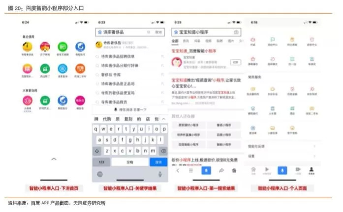以小程序为例,根据即速应用,2019年6月百度小程序人均使用时长为2.5分钟,低于支付宝4.8分钟和微信11.6分钟。从用户量来看,百度小程序月活3亿,微信6.8亿,支付宝4亿。