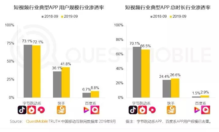 视频方面,根据QuestMobile的数据,2019年9月,百度系视频产品渗透率远低于字节跳动系,后者渗透率高达72%,而百度只有8.8%。