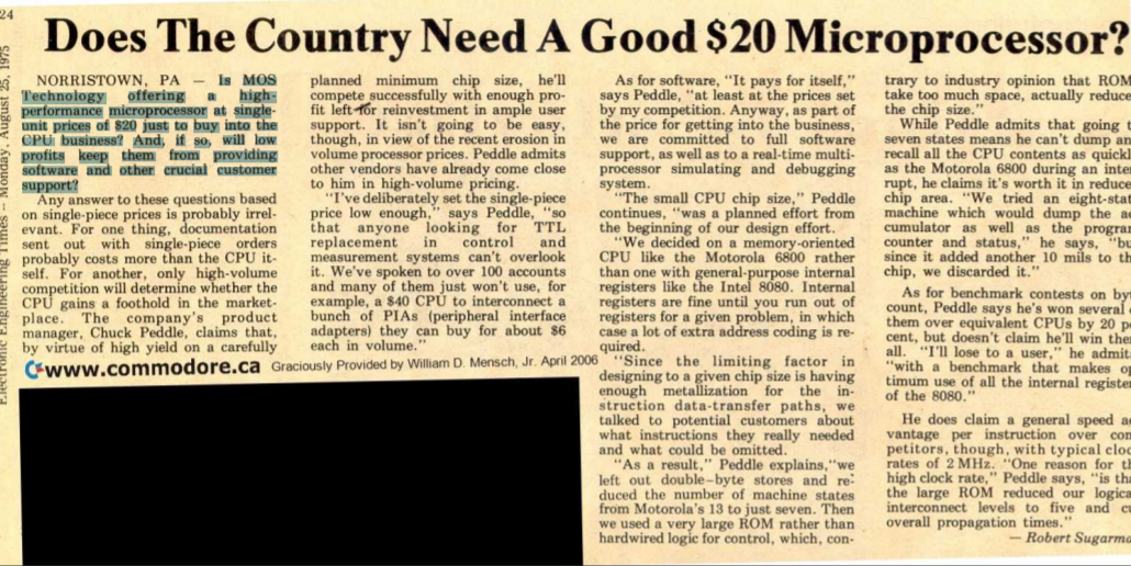 1975年8月,在6502推出时,美国的《电子工程时报》刊载了一篇对派朵的采访报道,题目为《我们是否需要一块20美元的微处理芯片?》,报道的开头是一连串疑问句:MOS Technology售价20美元的CPU芯片是不是烧钱换市场?若是,低利润会不会限制他们提供软件和服务?