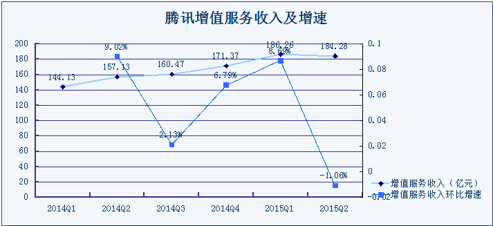增值服务收入在2014年以来的大部分时间里保持了增势,但在进入2015年第二季度后有所倒退,从一季度的186.26亿元降至二季度的184.28亿元,环比下降1.06%。