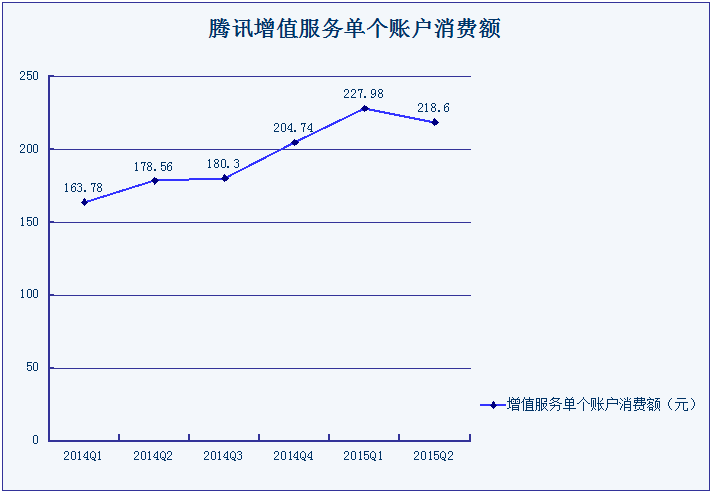 根据腾讯增值服务的付费账户数和收入,可以推算出腾讯增值服务单人消费额。这一数字的意义在于,代表了腾讯公司的重度用户愿意为腾讯各项服务付出的费用。单人消费额在去年以来的大部分时间里都保持了增长,不过在进入2015年第二季度后有所回落。2014年全年的单人消费额为756.39元,如果假设2015年上半年的单人消费额占全年的比例与2014年相同的话,则2015年单人消费额将达到992.4元。