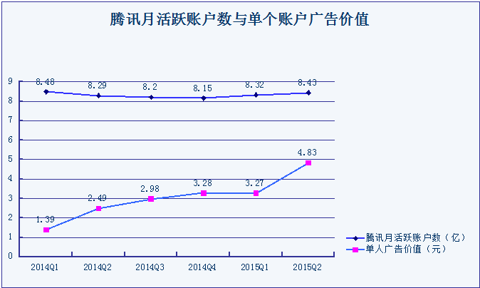 腾讯网络广告面对的是QQ和微信所有活跃用户,可以看到,2014年以来腾讯月活跃账户数(包含微信和跨越PC端、移动端的QQ)基本在8.15亿之上浮动,2015年第二季度的月活跃账户数为8.43亿。而腾讯单个账户广告价值则增长非常迅速,比如2015年第二季度为4.83元,相比第一季度增速为47.7%。单个账号广告价值的意义在于,代表了每个普通账号能为腾讯带来的广告收入。