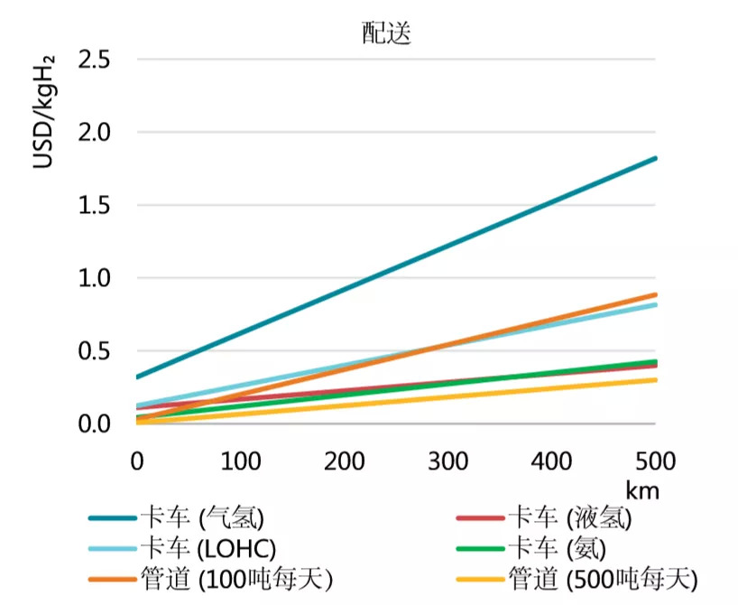 图3 各种输送方式氢配送费用(数据来源:IEA)
