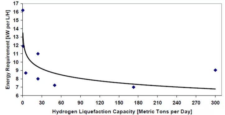 图5 氢液化能耗随氢液化规模变化图(来源:林德)