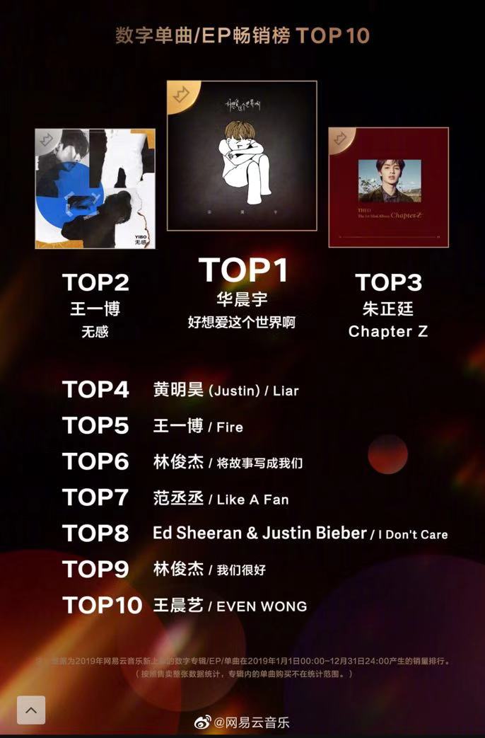 但不论评价如何,《无感》亮眼的成绩的确为网易云音乐的2019年画上了一个漂亮的句号,并冲淡了平台失去周杰伦版权的“阴霾”。这首年末上线的单曲拿下了网易云音乐年度数字单曲/EP销量榜的第二名。位列冠军的是华晨宇的新歌《好想爱这个世界啊》,而朱正廷的《Chapter Z》则拿到季军的成绩。值得注意的是,王一博也是前十中两次入榜的歌手,他于2019年1月17日发行的《Fire》位列第五名。放眼整个华语乐坛,能凭借一首单曲为平台带来千万收入的歌手并不多见.