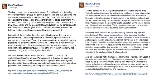 在发布声明1小时后,市长Beth Van Duyne又重新编辑了那个帖子。她在帖子里写道:“作为一位家长,我承认如果这件事发生在我的孩子身上,我也会非常烦躁。我真诚地希望,我们这个城市的学生都能被鼓励去发挥他们的创造性、发明能力,开发他们对手工的兴趣。希望我们都能从这件事中吸取经验。这位学生很有天赋,他并没有在开发电子和工程天赋的道路上灰心丧气。”