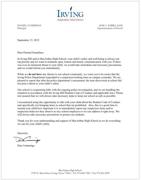就在事件发生的第二天,也就是9月15日,麦克阿瑟高中的校长Dan Cummings寄给Ahmed一封信。校长在信中表示,当地警方回应称校内有一个可疑的“爆炸物”,不过最终发现它只是Ahmed带到教室来的一个发明,并不对学校构成任何威胁。同时,校长在信中也强调了,尽管已确认这件可疑物品没有威胁到孩子的安全,但是校方仍然要采取必要的步骤去保护孩子的安全。校方并借此机会请家长和学生重温“学生行为准则”,特别是不应该将被严格限制的“危险物品”带到学校来的这项要求。