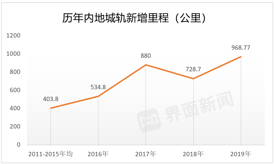 界面新闻记者查询资料了解到,中国内地城轨2018年新增运营里程为728.7公里,2017年新增里程880公里,2016年新增534.8公里;而在“十二五”(2011-2015)期间,累计新投运线路2019公里,平均每年约400公里。2019年新增的近千公里线路,大幅超过近十年的年增量。
