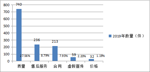 2019年度受理的投诉中,按投诉性质划分(如图1所示),质量问题投诉仍居首位,共740件,占到投诉总量的27.56%。其次是售后服务、合同、虚假宣传、价格等几方面问题。质量、售后服务和合同问题仍引发投诉的主要原因,占全年投诉总量的四成以上。