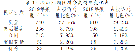 与2018年度比较(如表1所示),质量问题、售后服务问题和合同问题的投诉数量均有所增加,价格类投诉数量和占比超过安全类投诉,成为投诉数量的第五名。