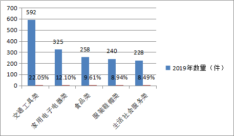 2019年商品和服务投诉中(如图2所示),交通工具类、家用电子电器类、食品类、服装鞋帽类、生活社会服务类投诉数量排在前五位,合计占投诉总量的61.19%。