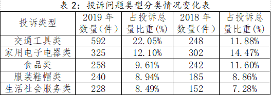 与2018年度比较(如表2所示),交通工具类投诉的数量和比重大幅上升,投诉数量达592件,占比22.05%。服装鞋帽类、生活社会服务类投诉数量和占比均有上升,家用电子电器类、食品类投诉数量虽有所增加,但投诉占比略有下降。